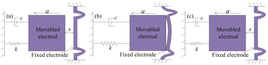 When the displacement of the movable electrode reaches x0, the elastic restoring force (f = kx0) equals the force (F = mat) attached to acceleration while the elasticity of the fixed electrode is ignored, which can be described as Equation (1).