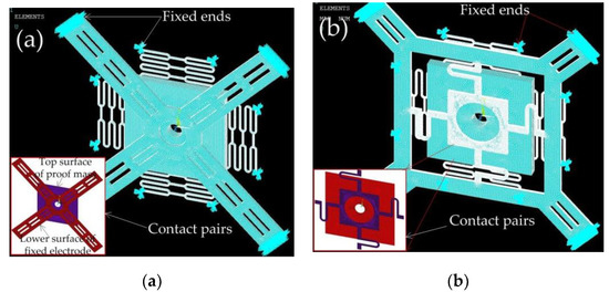 Finite element models of inertial switch with fixed electrode of (a) simply supported beam and (b) suspension spring.
