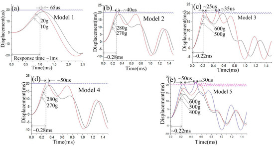 To investigate the contact process of the inertial switches with different fixed electrodes, the designed structures are modeled and simulated by ANSYS software. The finite element model of the inertial switch with a fixed electrode using the simply supported beam and suspension spring is shown in Figure 6a,b, respectively. The lower surface of the fixed electrode and the upper surface of the movable mass block are defined as a pair of contact surfaces. The end surfaces of the fixed electrode and movable electrode are defined as fixed surfaces. The nickel (Ni) electroplated by surface micromachining technology is selected as the structure, and the material parameters of Young’s modulus and the density are chosen as 165 GPa and 8.96 g∙cm−3, respectively [21]. The half-sinusoidal acceleration load with a pulse width of one millisecond is applied to the finite element models. The dynamic response curves of the inertial switch with different threshold accelerations are shown in Figure 7a–e. The dynamic response process indicates that the designed thresholds of models 1, 2, 3, 4, and 5 are 20, 280, 600, 280, and 600 g, respectively. The contact time is about 65, 40, 25, 50, and 50 μs, respectively. The response times are about 1, 0.28, 0.22, 0.28, and 0.22 ms, respectively. The response times from the simulation results are much more than those from the theoretical analysis because the duration of the applied load is ignored when the initial conditions of displacement and velocity () are applied to Equation (5) to reveal the minimum response time. The contact time decreases from 65 to 35 μs, and the contact time decreases from 1 to 0.22 ms, when the threshold increases from 20 to 600 g. As the response time is mainly determined by the inherent frequency () of the movable electrode, the response time of the device remains unchanged when the structure of the fixed electrode is replaced by the spring. When the fixed electrode with the simply supported beam is replaced by the suspension spring, the contact time is prolonged from 40 to 50 μs and 25 to 50 μs when the thresholds are 280 and 600 g, respectively.