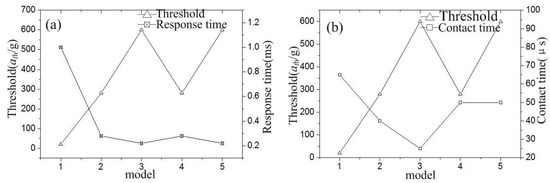 Figure 3 indicates that the response time (tre) increases with the threshold acceleration (a0). The minimum response times are about 450, 120, and 82 μs when the threshold is about 20, 280, and 580 g, respectively. The contact time decreases with the response time without considering other influencing factors. Thus, we have another conclusion that the contact time (tcon) decreases with the increase in threshold acceleration.