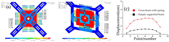 When the threshold acceleration of 600 g is applied to model 3 and 5, the maximum displacement of the inertial switch with the simply supported beam and suspension spring is obtained using ANSYS software, as shown in Figure 9a,b. By querying the grid data, the maximum displacement of the simply supported beam is about 1.65 μm, as shown in Figure 9a. The maximum displacement of the suspension spring is about 2.96 μm, as shown in Figure 9b. By comparing Figure 9a,b, it is found that the displacement of the spring fixed electrode is larger than that of the simply supported beam. The vibration tracks of the simply supported beam and cross beam with the spring are shown in Figure 9c. The stiffness of the fixed electrodes in model 3 and model 5 was calculated by ANSYS software as ~851 and ~675 n/m, respectively. Compared to the simply supported beam, the fixed electrode consisting of springs can more effectively extend the contact time due to a greater elastic displacement.