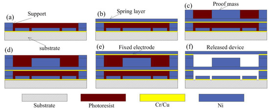The prototypes are fabricated by surface micromachining technology, all devices are manufactured on one wafer with the same set of masks, and the main preparation technique method includes the magnetron sputtering coating process, micro electroforming, and SU-8 photolithography techniques. The critical process steps are shown in Figure 10 and described as follows: