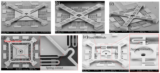 The designed models 1, 2, 3, 4, and 5 were fabricated by surface micromachining technology, as shown in Figure 11a–e. All the prototypes with the complete structure are shown in Figure 11.