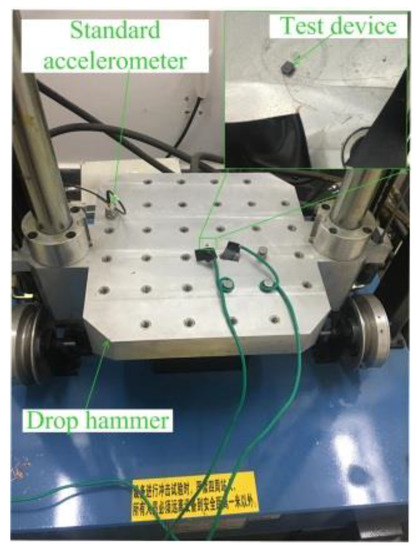 The fabricated inertial switch was tested by a hammer dropping experiment. The thresholds of five devices were tested by the drop hammer. The packaged device and standard accelerometer were fixed on the platform, as shown in Figure 12. The thresholds of the fabricated prototypes were measured by the dropping hammer, and the preset height of the hammer increases gradually from low to high, which means that the deceleration value applied to the test device increases gradually. When the acceleration reaches the threshold value of the testing device, the inertial switch will be switched on, and the trigger signal and acceleration curves will output to the oscilloscope. The test results of the devices with different thresholds are shown in Figure 13.