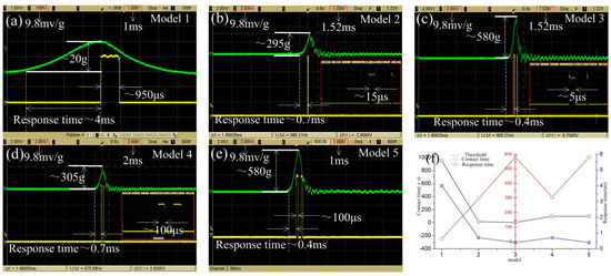 The test thresholds of model 1, 2, 3, 4, and 5 are 20, 295, 580, 305, and 580 g, respectively. The test results indicate that the contact time decreases from 950 to 5 μs when the threshold acceleration increases from 20 to 580 g. The test results of the prototypes with the spring fixed electrode shown in Figure 13d,e show that, compared to model 2 and 3, the contact time is prolonged to 100 μs when the thresholds are 305 and 580 g, which indicates that the contact time can be prolonged due to the elastic fixed electrode. This is because the contact time mainly depends on the stiffness of the fixed electrode under the overload acceleration. Figure 13f shows the relation curves of the contact time and response time with increasing threshold. The curves indicate that the contact time and response time decrease with the increasing threshold; meanwhile, the effect of contact is improved due to the fixed electrode alternating by the elastic structure, and the contact time is effectively prolonged.