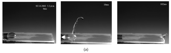 A 10 μL water droplet was deposited directly onto the IDT via micro-syringe. Figure 6a–c shows the movement of the droplet on the SAW device surface before and after interaction with a SAW at a center frequency of 30 MHz and an RF power of 4.68 W (−7.5 dBm) for different coating thicknesses. Before applying the RF signal, the droplet was at rest on the IDT. After applying the SAW power, the IDT generated a pressure gradient that caused the droplet to deform into a conical shape; as the energy in the droplet increased, the droplet began to creep. As shown in Figure 6a, with a coating thicknesses of 3.2 μm, the undulation of the droplet surface led to the elongation of a crest at 10 ms, then crept to the end of the device, where it began to eject droplets at 102 ms. With increasing coating thicknesses, the time that the droplet took to creep to the end of the device and deform into a conical shape increased, as shown in Figure 6b. With a coating thickness of 5.2 μm, the droplet was observed to vibrate, but without forming a crest at 35 ms followed by a very slow creep on the surface of the device; no deformation or ejection occurred at 3200 ms. This was because as the thickness of the coating increased, the film absorbed the energy of the SAW. The following sections discuss the effect of the coating on atomization characteristics and heat dissipation.