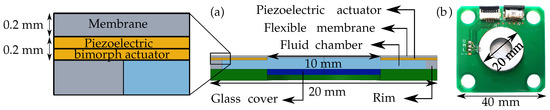 (a) 2D cut section of the adaptive lens to show the fluid chamber, flexible membrane, and the integrated actuator. (b) The adaptive fluid-membrane piezoelectric lens.
