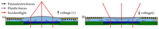 The 2D cross-section of the adaptive lens showing the piezoelectric forces and fluidic forces, which form either (a) plano-convex lens or (b) plano-concave lens depending on the applied voltage direction.