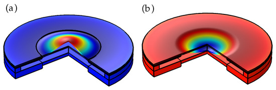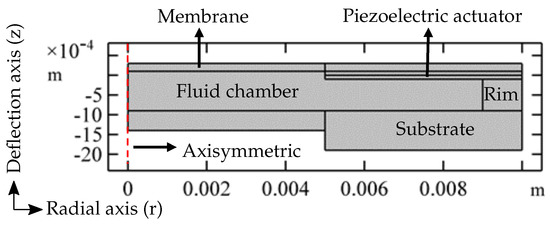 Equations (8) and (9) equate the solid velocities and , which are produced by the piezoelectric actuator in radial axis (R) and deformation axis (Z), to the corresponding mesh velocities and . The mesh velocities applied to the fluid chamber wall are implicitly considered to be the external forces in the Navier–Stokes Equation (5) of the fluid-structure interaction physics module Equation (4). In this way, the moving mesh module explicitly couples the piezoelectric actuator force to the fluid force.