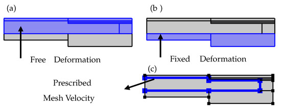 The adaptive lens working mechanism relies on the transfer of piezoelectric forces to the flexible membrane through the fluid forces. In COMSOL Multiphysics®, the coupling of the piezoelectric effect and the fluid-structure interaction is not possible through a direct Multiphysics feature. Hence, the moving mesh physics module is used to couple the piezoelectric forces with the fluid forces and apply the resultant on the flexible membrane. The explicit coupling of piezoelectric and laminar flow physics is performed in a way such that the solid domain velocities Equations (8) and (9) generated by the deformation of the piezoelectric actuator are applied as the mesh velocities on the walls of the fluid chamber as shown in Figure 4c. The geometric domains with the free deformation mesh and with the fixed mesh are as shown in Figure 4a,b, respectively.