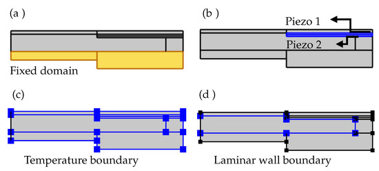 Domains with fixed boundary condition in solid mechanics physics module (a), piezo 1 with default base vector system and piezo 2 with modified base vector system (b), domains with temperature boundary condition in heat transfer in solids and fluids physics modules (c), and domains with wall boundary condition in laminar flow physics module (d).