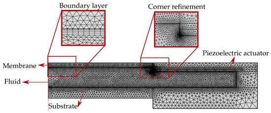 The explicit coupling of the piezoelectric forces with the fluidic forces is achieved through the mesh velocities applied on the walls of the fluid chamber (Figure 4c). Hence the walls of the fluid chamber are finely meshed with the use of corner refinement and boundary layer mesh features (Figure 6). The remaining domains including fluid, piezoelectric actuator, membrane, and the substrate are meshed with the inbuilt physics-controlled mesh.