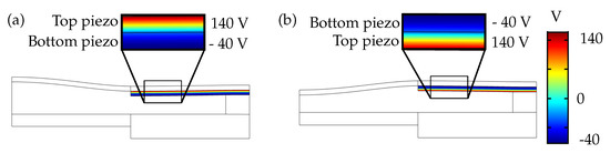 Applied voltages on the piezoelectric actuator with (a) convex lens mode and (b) concave lens mode.
