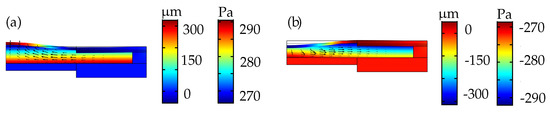 The surface plots in Figure 9a,b show the membrane deformation and the corresponding dynamic internal fluid pressure during actuation. The arrows indicate the fluid velocity direction during actuation. For the plano-convex lens in Figure 9a, in which the piezoelectric actuator is set to a maximum voltage combination results in positive internal pressure of around 270 and a peak deflection of around 300 at the center of the membrane. For the plano-concave lens in Figure 9b, in which the voltage combination is reversed compared to the former case, the actuator deforms outwards resulting in negative fluid pressure of around and a peak deflection of around at the center of the membrane.