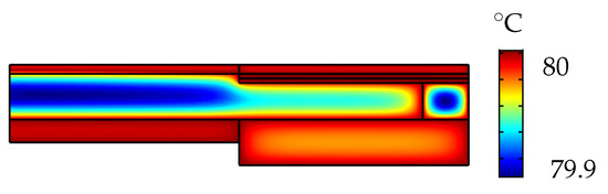 The heat transfer interface for solids and fluids was used to set the adaptive lens to a temperature ranging from 20 °C–80 °C. The surface plot in Figure 10 shows the temperature distribution of the adaptive lens set to 80 °C with the actuator voltage set to 0 . The expansion of the fluid at 80 °C corresponds to an increase in fluid pressure of around 85 and a peak deflection of around 80 at the center of the membrane.
