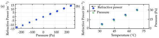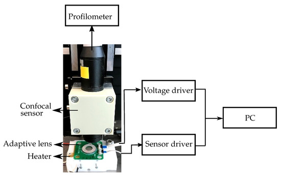 Furthermore, to verify the simulation results, we characterized the adaptive lens at different applied voltages and temperatures [7]. The adaptive lens integrated with a pressure sensor and a temperature sensor, to compensate for the non-linear piezoelectric hysteresis and the fluid thermal expansion effect [7,26], was used in the characterization. Figure 12 shows the block diagram of the experimental setup used to characterize the adaptive lens.
