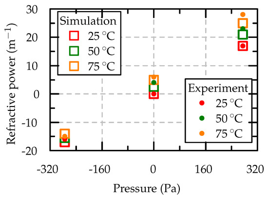 Our simulation model successfully couples the piezoelectric physics with the laminar flow and heat transfer physics modules. Both prove that the adaptive lens was simulated at different voltages and temperatures to determine the actuator deflection, the fluid pressure, and the refractive power. The simulated results are in close agreement with the experimental results. The adaptive lens can vary the refractive power from to at 25 °C and from to at 75 °C. With this validation, we can now use our model reliably for further geometric optimization of our adaptive lens. Furthermore, the simulation model could be extended to also model the piezoelectric hysteresis and change in piezoelectric coefficients with the temperature.