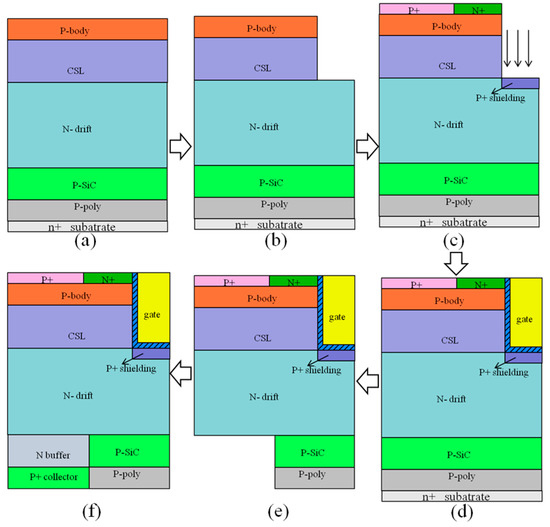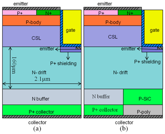 - Shen, Z.; Zhang, F.; Tian, L.; Yan, G.; Wen, Z.; Zhao, W.; Wang, L.; Liu, X.; Sun, G.; Zeng, Y. Optimized P-emitter doping for switching-off loss of superjunction 4H-SiC IGBTs. In Proceedings of the 13th China International Forum on Solid State Lighting: International Forum on Wide Bandgap Semiconductors China (SSLChina: IFWS), Beijing, China, 15–17 November 2016; pp. 1–5. [Google Scholar]