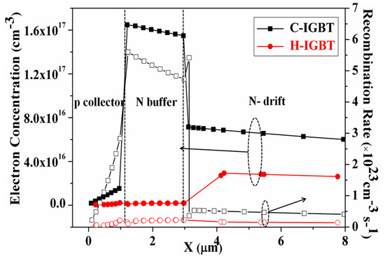 - Deng, G.Q.; Luo, X.R.; Zhou, K.; He, Q.Y.; Ruan, X.L.; Liu, Q.; Sun, T.; Zhang, Bo. A snapback-free RC-IGBT with Alternating N/P buffers. In Proceedings of the 29th International Symposium on Power Semiconductor Devices and ICs (ISPSD), Sapporo, Japan, 28 May–1 June 2017; pp. 127–130. [Google Scholar]