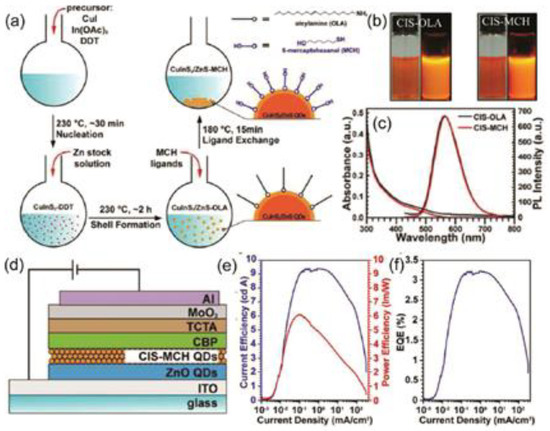 - Bai, Z.L.; Ji, W.Y.; Han, D.B.; Chen, L.L.; Chen, B.K.; Shen, H.B.; Zou, B.S.; Zhong, H.Z. Hydroxyl-terminated CuInS2 based quantum dots: Toward efficient and bright light emitting diodes. Chem. Mater. 2016, 28, 1085–1091. [Google Scholar] [CrossRef]