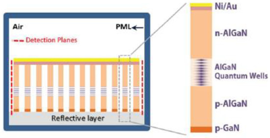 - Yun, J.; Hirayama, H. Investigation of the light-extraction efficiency in 280 nm AlGaN-based light-emitting diodes having a highly transparent p-AlGaN layer. J. Appl. Phys. 2017, 121, 013105. [Google Scholar] [CrossRef]