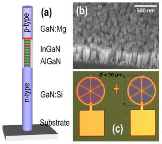 - Philip, M.R.; Choudhary, D.D.; Djavid, M.; Bhuyian, M.N.; Piao, J.; Pham, T.T.; Misra, D.; Nguyen, H.P.T. Controlling color emission of InGaN/AlGaN nanowire light-emitting diodes grown by molecular beam epitaxy. J. Vac. Sci. Technol. B 2017, 35, 02B108. [Google Scholar] [CrossRef]