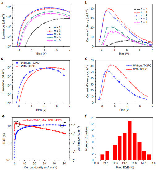 - Wang, N.; Cheng, L.; Ge, R.; Zhang, S.T.; Miao, Y.F.; Zou, W.; Yi, C.; Sun, Y.; Cao, Y.; Yang, R.; et al. Perovskite light-emitting diodes based on solution-processed self-organized multiple quantum wells. Nat. Photonics 2016, 10, 699–704. [Google Scholar] [CrossRef]
