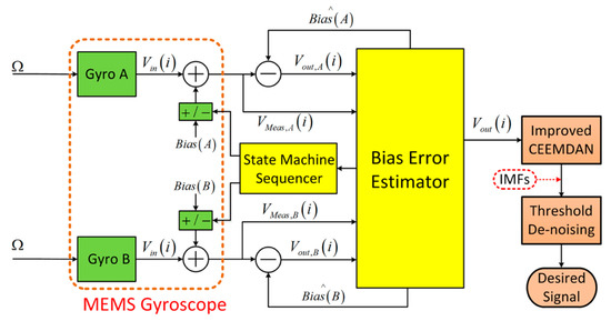The single gyroscope bias drift self-calibration model described in Section 2.1 is helpful for principle analysis and performance projections; nevertheless, several difficulties have to be solved to realize a practical real-time self-calibrated system with uninterrupted output. Such a system can be designed using an additional gyroscope for a single axis system. The single axis system in this work consists of two collinear gyroscopes, a state machine sequencer, a bias estimator, and the threshold denoising algorithm based on improved CEEMDAN; it is shown in Figure 4.