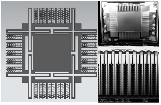 To verify the feasibility of the proposed self-calibration system, the relevant experiment was carried out. The gyroscope we tested which has a symmetrical structure is fabricated by SOI processing, as shown in Figure 6, and the total dimensions of the sensing element are 4 4 mm [21].