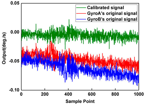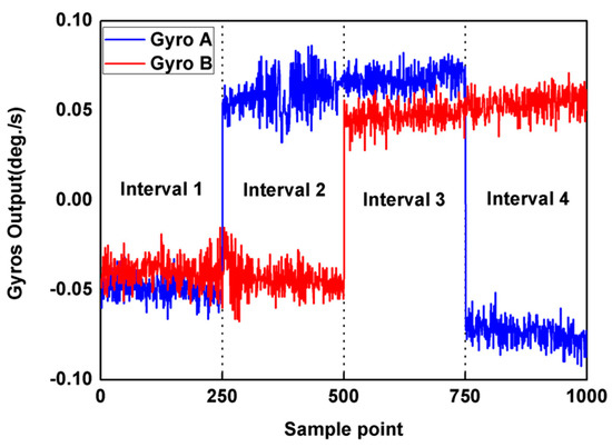 The output signal data was collected with 50 Hz sampling frequency and was recorded in PC with 1 s average value. The outputs of two collinear gyroscopes were recorded for 1000 s at 25 °C controlled temperature, and each measurement interval contains 150 points, as shown in Figure 8.