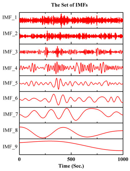 From Figure 9, it is obvious that there is a large amount of irrelevant noise in the calibrated signal of mode reversal. In order to eliminate the influence of the additional noise in the calibrated signal on the measurement accuracy of MEMS gyroscopes, the threshold denoising method was adopted here. As described in Section 3, the first step of threshold denoising is to decompose the calibrated signal of mode reversal into a set of IMFs using the improved CEEMDAN. The decomposition results of calibrated signal of mode reversal are given in Figure 10.