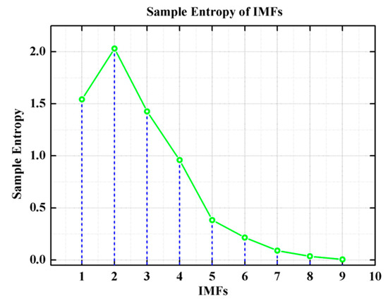 In order to find the noise dominant IMF from the set of IMFs, the sample entropy of each IMFs is calculated according to Equation (35). The calculated result of the sample entropy of each IMFs is shown in Figure 11.