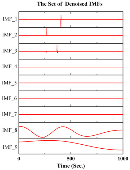 After the calculation of sample entropy of each IMF, the first two IMFs which have the highest sample entropy are selected as pure noise signal. The robust estimator shown in Equation (36) can be applied to estimate the standard deviations of noise contained in the two selected IMFs: