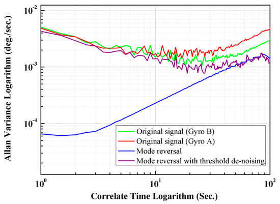 The Allan variance method, which is a widely used quantitative performance evaluation method for inertial sensors [22], was applied for the quantitative comparison of calibration results of different methods. Figure 14 shows the Allan variance analysis of un-calibrated output signals of Gyro A and B, and the calibration results of the typical mode reversal and the proposed improved CEEMDAN-mode reversal method; and Table 1 shows the quantitative results in detail.