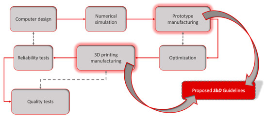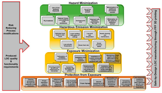 Development of a LOC device initiates from the design and concludes with the quality testing of the finished products. The proposed SbD approach corresponds to the manufacturing-related stages of the development procedure, which are the initial prototyping and the main manufacturing phases (Figure 2). The available knowledge about the risks involved in LOC production through FFF is adapted and restructured into guidelines that inform on adjustments that reduce risk, and a framework of process design choices that can ensure Safety-by-Design is formulated. An effective Safe-by-design scheme presupposes that a well-rounded collection of information on the safety aspects of a technology is available. This involves thorough knowledge regarding all modifiable design aspects of a process (e.g., materials, equipment functional parameters, work practices), and a risk analysis assessment and management outlook, in order to acknowledge hazards during each process stage and present the manner in which these hazards can be diminished or eliminated by adjusting specific design parameters.