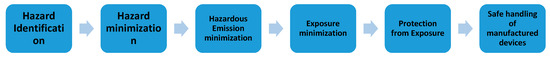 In this present SbD approach, the process of determining the most effective risk mitigation actions is organized in six stages, following the functional progression of lab-on-a-chip manufacturing: (1) Hazard Identification, (2) Hazard minimization, (3) Hazardous Emission minimization, (4) Exposure minimization, (5) Protection from exposure, (6) Safe handling of manufactured devices (Figure 3). This linear order corresponds to a hierarchy in terms of order of investigation and implementation, placing priority on earlier stages of the process. For example, adjustments that reduce the release of particles should be prioritized over mitigation actions that aim to reduce exposure after release takes place.