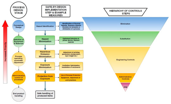The foundation for determining appropriate safety practices is laid through the accumulation of available information on the hazards that are expected to be encountered in the context of FFF processes. Evaluation and analysis of these findings can provide insight for confident decision-making on material selection, the adjustment of process parameters, and the establishment of effective administrative practices to facilitate safe manufacturing. Figure 4 presents an outline of the structure of the proposed SbD strategy, along with the corresponding process stage, and hierarchy of controls connection for each type of measures. In the conceptual design stages of the technology, fundamental design decisions are being made, and based on what is known about the hazards involved, specific risks can be eliminated through guided design. After the basic characteristics of the process have been determined, equipment and materials are selected. In this stage, hazardous elements can be substituted with alternatives of reduced hazard. The third stage concerns the manner in which the equipment and process operates, and how the materials are being manipulated. Insight is provided regarding process modifications, in the form of, e.g., equipment functional parameter optimization, or the installation of engineering controls (e.g., installation of ventilated enclosures) that can offer significant risk reduction. As materials, instruments, and operating conditions are fixed, the fourth stage relates to identifying optimal administrative and occupational practices, to enhance safety by protecting employees from potential exposure to hazards. The final stage is associated with the safe handling, storage and use of the produced devices.