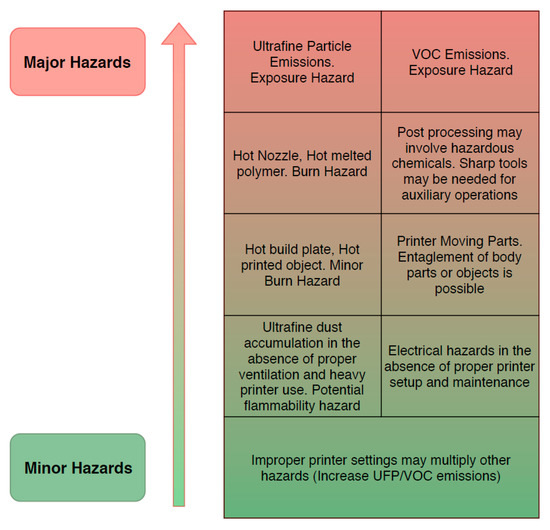 The FFF process can present several other hazards of various types. Additionally, print preparation and post processing procedures may introduce distinct hazards. Figure 5 presents a list of the hazards exhibited in FFF processes, prioritized based on their severity.