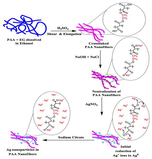 PAA solution (4 wt%) was made as a result of dissolving PAA in ethanol. EG was then added as a crosslink agent at the concentration 16 wt% relative to the polymer. The PAA and EG were dissolved in ethanol and stirred for 24 h at 25 °C to obtain a homogenous solution. Before electrospinning, 1 M sulfuric acid as a catalyst was mixed with the PAA–EG solution (50 µL/mL) for thermal esterification. Sulfur is a good disinfectant and a toxic composition, but the addition of a small amount of sulfuric acid enhances the stability of Ag ions.