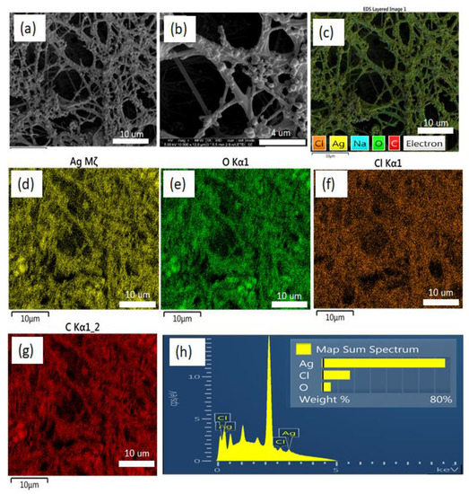 (a,b) Representative SEM micrographs of silver containing PAA nanofibers. EDS elemental maps from (c) all elements (d) Ag, (e) O, (f) Cl, (g) C on the PAA-silver nanofibers substrate. (h) is the EDS of the PAA-silver nanofibers.