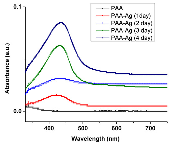 UV-visible absorption is an alternative method to confirm the formation of silver NPs in the electrospun PAA hydrogel. The UV-vis absorption spectra of pure PAA and silver NP-containing PAA fibers are demonstrated in Figure 4. The electrospun PAA did not show any peak in the region of 300 to 500 nm, while the PAA-silver hydrogel showed a strong absorption peak around 430 nm related to the cluster-polymer interactions [25,26]. This peak is due to the plasmon resonance excitations from the quantum size of silver NPs [27]. The increment of the absorption peak in the UV-vis represents the formation of NPs through chemical reduction process, which indicates the formation and growth of silver NPs over time. It is to be noted that the kinetics of silver loading was slow in the first and second days and followed by a rapid increase in the third and fourth days.