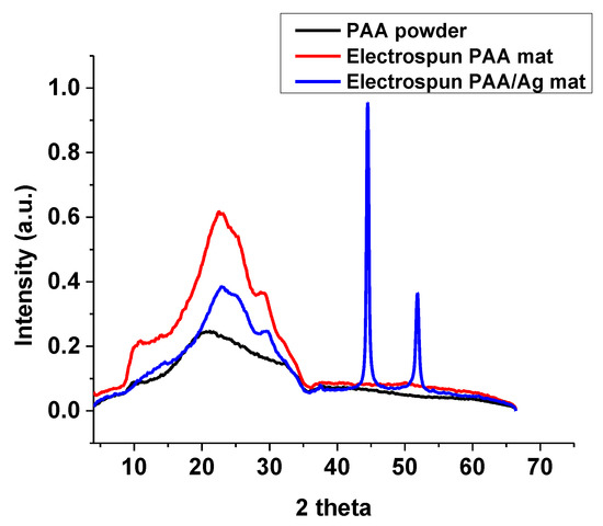 The XRD patterns of PAA powder, crosslinked electrospun PAA, and electrospun PAA-silver nanofibers (5 mM AgNO3).