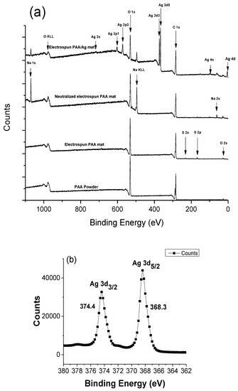 To confirm the formation of Ag NPs from the chemical reduction method, XPS was used to identify the change in the reduction process from the preparation of electrospun PAA to the reduction of silver ions using citrate ions. The upper most spectrum of Figure 6a shows the composition of the sample after Ag Np formation, revealing silver, oxygen, sodium, and small quantities of chlorine, and sulfur. The appearance of Cl, Na, and S comes from sodium citrate, sodium chloride, and sulfuric acid during both the neutralization and thermal esterification processes. The XPS analysis elucidated the surface state composition of the crosslinked PAA-silver materials. Figure 6b shows the full spectrum reveals silver to exist with two different binding energies.