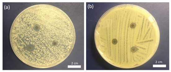 The antibacterial and antifungal activities of PAA nanofibers with silver NPs were evaluated from the culture collection against (fungi) C. albicans SC5314 and (bacteria) MRSA USA 300 using disk diffusion. In these instances, the cultures were filled with PAA-silver fibers and then incubated for up to 24 h at 37 °C, and the diameter of inhibition zone was measured to determine around the tested samples. The antibacterial activities of PAA nanofibers with and without silver ions and particles were evaluated against MRSA by disk diffusion method to measure the diameter of inhibition zone under and around the tested samples. Brain heart infusion agar was autoclaved at 120 °C for 15 min and cooled in sterile Petri-dishes to from a 2 mm thick slab. For antibacterial assessment, 300 mL of bacterial solution with about 108 CFU·mL−1 of MRSA was dispensed onto an agar plate and then hybrid PAA-silver nanofibers samples were covered on the surface of the plate. For antifungal assessment, 300 mL of C. albican solution with about 3–5 × 107 CFU·mL−1 was covered onto the agar and plate. Then PAA-silver containing nanofibers (5 mM AgNO3) were placed onto the agar surface. After incubation at 37 °C for 24 h, the bacterial growth inhibition halos were observed.