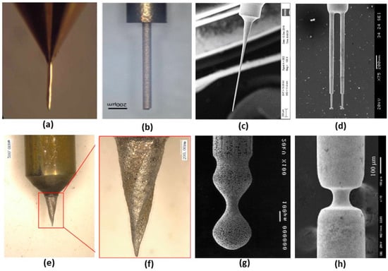 - Huang, C.A.; Chang, J.H.; Yang, S.Y.; Yang, C.C. Preparation of a needle probe with a sharp tip and high aspect ratio geometry by an electrochemical etching method. Corros. Sci. 2006, 48, 4294–4302. [Google Scholar] [CrossRef]