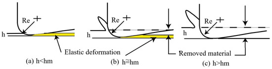 As observed, the majority of the processes for manufacturing microrods and microtools are nonconventional, especially discharge machining, and require cutting fluids that are harmful to the environment. Therefore, dry or near-to-dry cutting is gaining popularity over the years. One of several beneficial outcomes of dry machining is the improved environmental performance from the elimination of the cutting fluids [15]. Moreover, the principals of tool-based micromachining are similar to those of conventional macro cutting. Thus, an understanding of microchip formation is an utmost necessity to predict the micro cutting process. The concept of the chip formation is illustrated in Figure 2 [16]. From the schematic relationship of minimum chip thickness (hm) and actual chip thickness (h), it is inferred that chip formation will not occur unless the chip thickness reaches a certain value for material removal during micromachining and micro grinding. In this respect, ultraprecision machining, including turning, milling, grinding, and polishing, is utilized for chip removal in microscale to manufacture the high quality microstructured components [17].