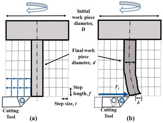 Microrods are manufactured by applying the micro cutting mechanism of the micro turning process in a stepwise scheme, as shown in Figure 5a. The stepwise maneuver helps to avoid the workpiece deflection shown in Figure 5b. The turning is performed in steps where the step size (t) is defined by the cutting depth in the radial direction. The step length (f), at which the rod will not undergo permanent deformation, is calculated from Equations (1) and (2).