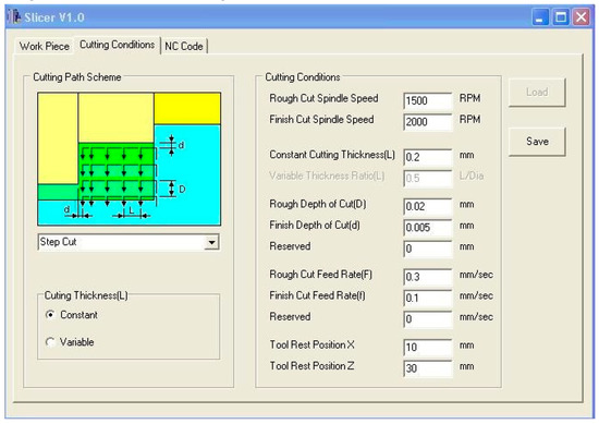 Precise control of the axis of a micromachine, with positioning error of less than 1 µm, is necessary to obtain micron-range machining dimensions [19]. Hence, the step cutting process of the microrod requires bespoke lines of numerical control (NC) codes that are not available in the usual computer-aided manufacturing (CAM) software. Thus, the SLICER program was developed, using C++ (Borland, Austin, TX, USA), to generate the CNC program (NC Codes) for the step cutting process by loading the workpiece profile and selecting the appropriate cutting parameters. Figure 6 shows the graphical user interface (GUI) of SLICER for the rough cutting condition with 1500 rev/min of spindle speed, 0.02 mm cutting depth (step size), 0.3 mm/s feed rate, and 0.2 mm cutting thickness (step length). The finish cutting conditions are as follows: 2000 rev/min spindle speed, 0.005 mm cutting depth (step size), and 0.1 mm/s feed rate. The X and Z axes tool rest positions are 10 mm and 30 mm, respectively. The NC codes, generated using the cutting conditions, were uploaded to the user interface of the micromachining center to run and perform the machining operation. Subsequently, the proposed microrod with straight end, as shown in Figure 3a, was fabricated using the step cutting scheme illustrated in Figure 5a.