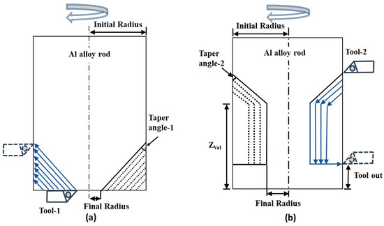 The conical end of the microrod shown in Figure 3b was generated by taper micro turning. In this approach, the forward cutting is performed by moving the tool parallel to the tapered surface while rotating the workpiece. The approach is illustrated in Figure 7a. The grooved end of the microrod shown in Figure 3c was fabricated by combining the step cutting and taper turning process for a reverse cutting scheme. This is illustrated in Figure 7b.