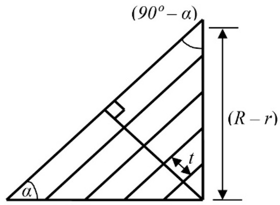 For step size (t), taper angle (α), initial taper radius (R) and final taper radius (r), the required rough cuts parallel to the tapered surface (nt) are calculated from Figure 8 using Equation (3).